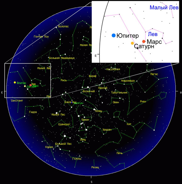 На звёздном небе восходит яркий Юпитер в созвездии Льва, после Сатурна и Марса [Рис. А. IX.8].