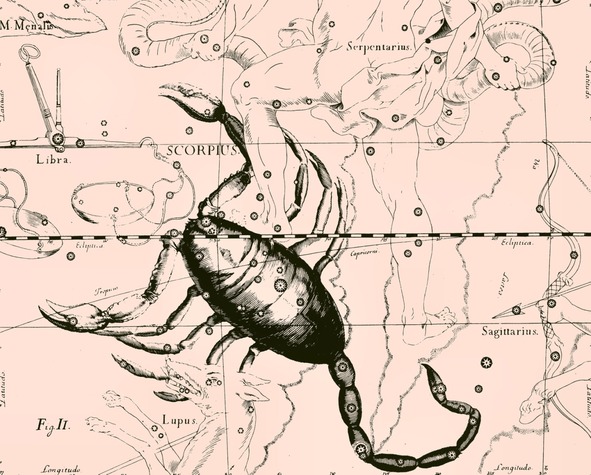 Скорпион изображен погрузившимся ниже Эклиптики «по брови». Хвост Скорпиона и Лук Стрельца лежат на Млечном Пути (Via Lactea).