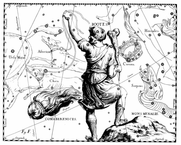 Слева созвездие Большая Медведица (Ursa Major), в руках Волопаса сворки, ни которых сидит созвездие Гончие Псы – Астерион (Asterion) и Чара (Chara), под ними созвездие Волосы Вероники (Coma Berenices). Справа созвездие Северная Корона (Corona) за спиной созвездия Геркулес (Hercules), ниже голова созвездия Змея (Serpens), разевающей пасть на созвездие Северная Корона. Волопас опирается ногой на созвездие Гора Менала (Mons Menalus), сегодня не существующее, в руках у него дубина. Созвездия Гончие Псы, Волосы Вероники и Гора Менала были введены Яном Гевелием, из них прижилось только созвездие Гончие Псы.