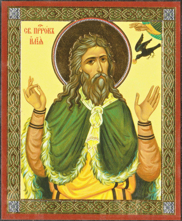 Илья пророк, повелитель громов и молний, единственный пророк, удостоенный быть Богом. На плечах пророка Илии – полушубок мехом внутрь, «дублёнка», как называют эту одежду сегодня. Пищу Илии приносит ворон. Здесь пророк Илия изображен не седобородым, как на других иконах.