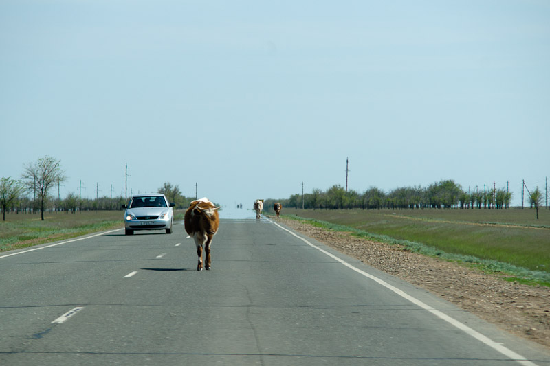Дорога идёт вдоль реки Урал по правому берегу (есть ещё и по левому). Она абсолютно ровная, прямая и гладкая. По обочинам деревья с громадными гнездами на них, часть деревьев сухие, без листьев. Реки не видно. Видно только степь с миражами, коровами: