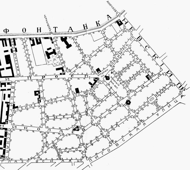 Владимирский и Загородный проспекты, повторяя плавный изгиб Фонтанки, вместе с набережной ее левого берега составляли главную магистраль Московской части1 Санкт-Петербурга, обеспечивавшую наиболее короткий путь из центра города в южном направлении.