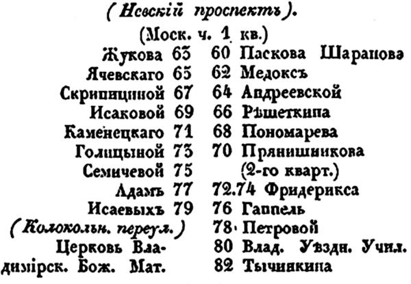 До введения в 1855 г. современной четности сторон улиц и нумерации домов Владимирский проспект служил продолжением Литейного, что отражено в приведенном ниже списке домовладельцев из Адресной книги Санкт-Петербурга на 1854 г.: