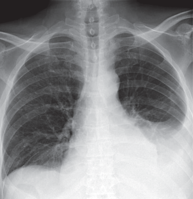 Пациент М., 42 года, обратился в поликлинику с жалобами на повышение температуры тела до 38,4 °C, кашель со скудной мокротой, кровохарканье, одышку при физической нагрузке. Из анамнеза известно, что заболел около 2 недель назад после переохлаждения. Самостоятельно принимал жаропонижающие, отхаркивающие препараты, но без существенного эффекта, что в итоге и послужило поводом для обращения в поликлинику. В анамнезе имеются указания на АГ с максимальными цифрами 150/90 мм рт. ст. Принимает амлодипин 5 мг в день. Курит много лет, около 1,5 пачки сигарет в сутки. Работает инженером. В армии служил. Контакт с инфекционными больными отрицает, дома все здоровы.
