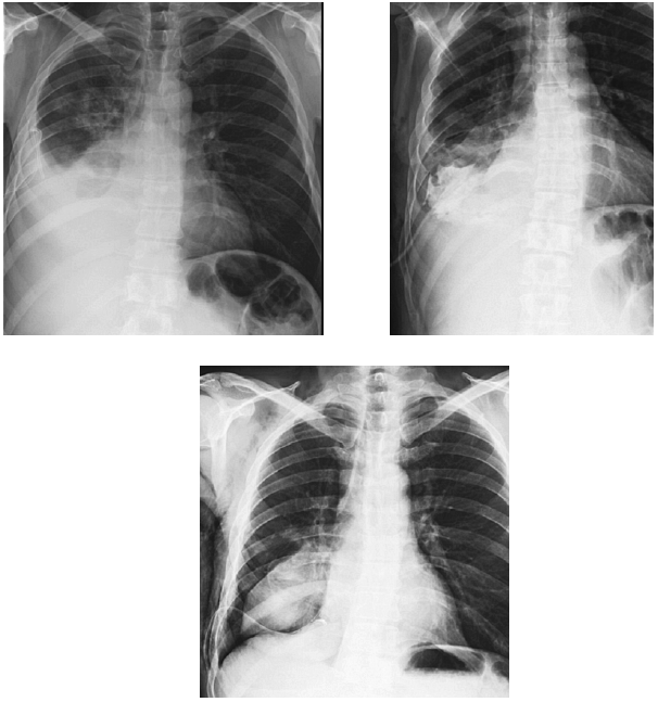 Рис. 3. Рентгенологическая картина пациента М. при первичном обращении (выпот в плевральной полости) и после дренирования плевральной полости (наличие опухоли)