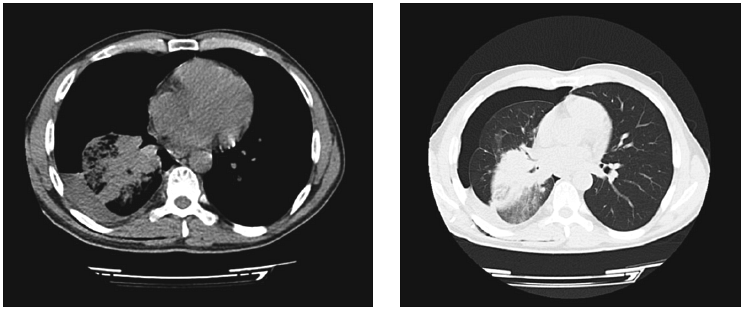 Рис. 4. КТ-картина образования правого легкого с выпотом в правой плевральной полости у пациента М.