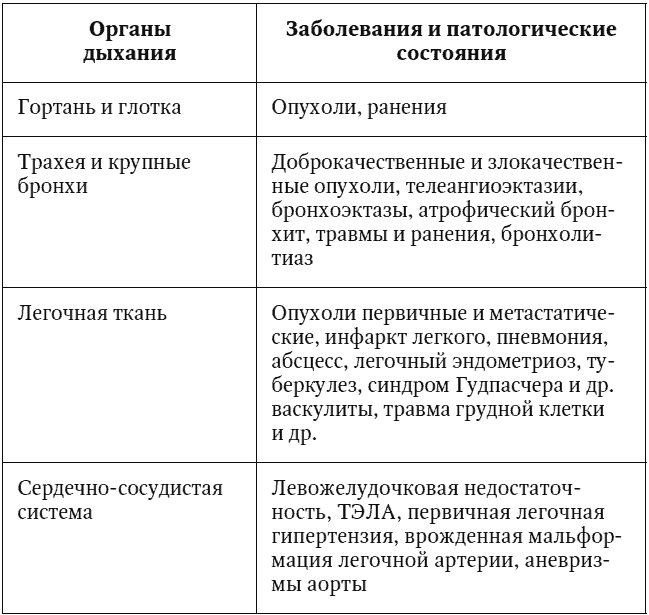 В целом заболевания и патологические состояния, которые потенциально могут осложниться развитием кровохарканья и легочного кровотечения, можно представить в виде таблицы (табл. 1).