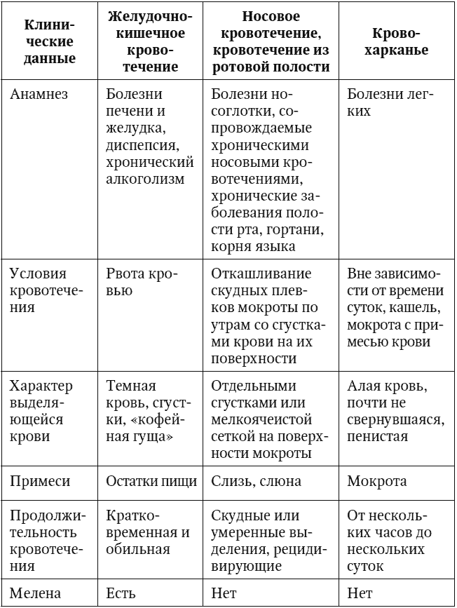Так, при наличии анамнестических данных за заболевания желудочно-кишечного тракта (эрозивно-язвенные поражения, заболевания печени, в том числе на фоне хронического алкоголизма и пр.) необходимо исключение желудочно-кишечного кровотечения. Кроме того, следует учитывать, что при ЖКК наблюдается рвота с кровью, которая имеет темный цвет, приобретая вид «кофейной гущи», а также развитие мелены. Носовое кровотечение или кровотечение из полости рта можно предположить при наличии в анамнезе заболеваний полости рта, носоглотки, в том числе злокачественных новообразований. При этом происходит откашливание скудных плевков мокроты по утрам со сгустками крови на их поверхности.