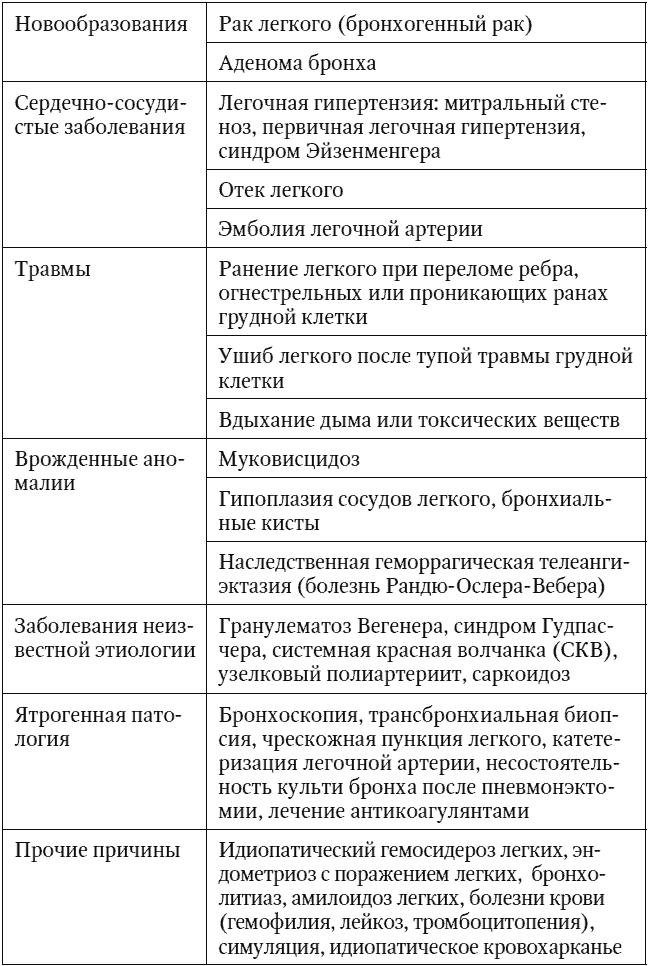 Однако на сегодняшний день все возможные причины развития кровохарканья удобнее классифицировать по следующим рубрикам (табл. 4):