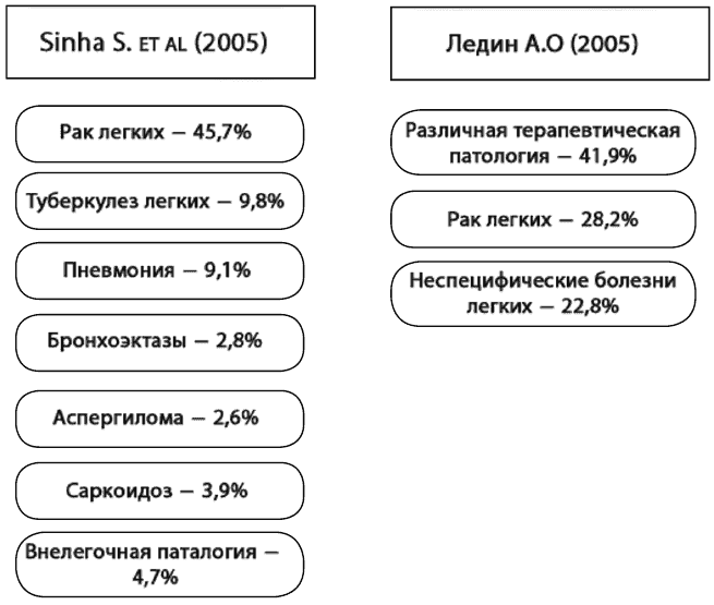 Так, в 2005 году зарубежными исследователями Sinha S. et al. сообщено о 429 пациентах с КХ, которым была выполнена фибробронхоскопия. В результате рак легких был диагностирован в 45,7 % случаев, туберкулез легких – 9,8 %, пневмония – 9,1 %, бронхоэктазы – 2,8 %, аспергилома – 2,6 %, саркоидоз – 3,9 %, внелегочная патология – в 4,7 % случаев. Эти данные значительно отличаются от результатов десятилетнего исследования, проведенного отечественными учеными во главе с Лединым А.О. (2005) в клинике общего профиля (рис. 5). Среди основных причин КХ на первом месте оказалась различная терапевтическая патология (41,9 %), на втором – рак легких (28,2 %), на третьем – неспецифические болезни легких (22,8 %). Эти результаты подтверждаются данными мировой литературы, согласно которым в настоящее время самой частой причиной КХ в пульмонологической клинике является хронический бронхит.