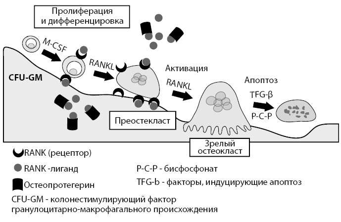 В окончательный путь остеокластогенеза было предложено включать три составляющие системы цитокинов: активатор рецепторов ядерного фактора Кβ лиганд (RANKL), его рецептора – активатора ядерного фактора Кβ (RANK) и его растворимого рецептора-приманки, остеопротегерин (ОПГ).