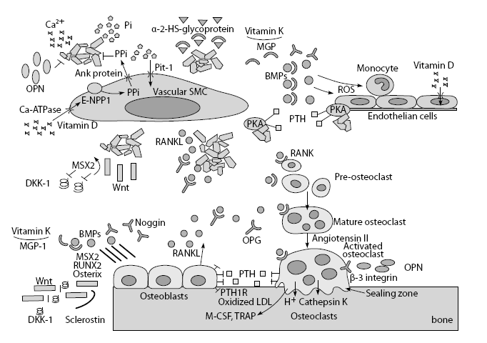 BMP участвуют в дифференцировке остеобластов, одновременно оказывая влияние на синтез АФК и усиливая адгезию моноцитов к сосудистой стенке. Действие этих белков блокируется MGP, витамин K-зависимым белком, который также угнетает минерализацию сосудистой стенки в качестве кофактора α2-HS-гликопротеина (также известен как фетуин-A). RANKL является ключевым фактором созревания остеокластов, а также препятствует кальцификации. OPG предотвращает связывание RANKL с его рецептором.