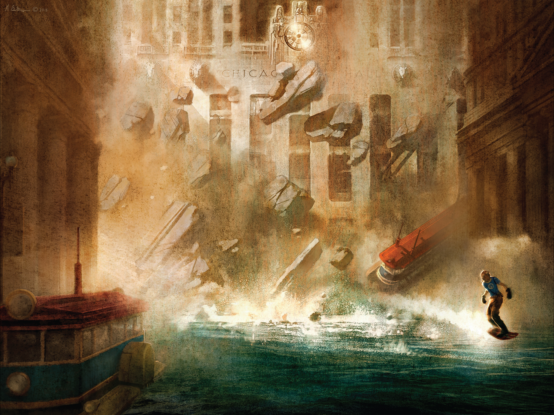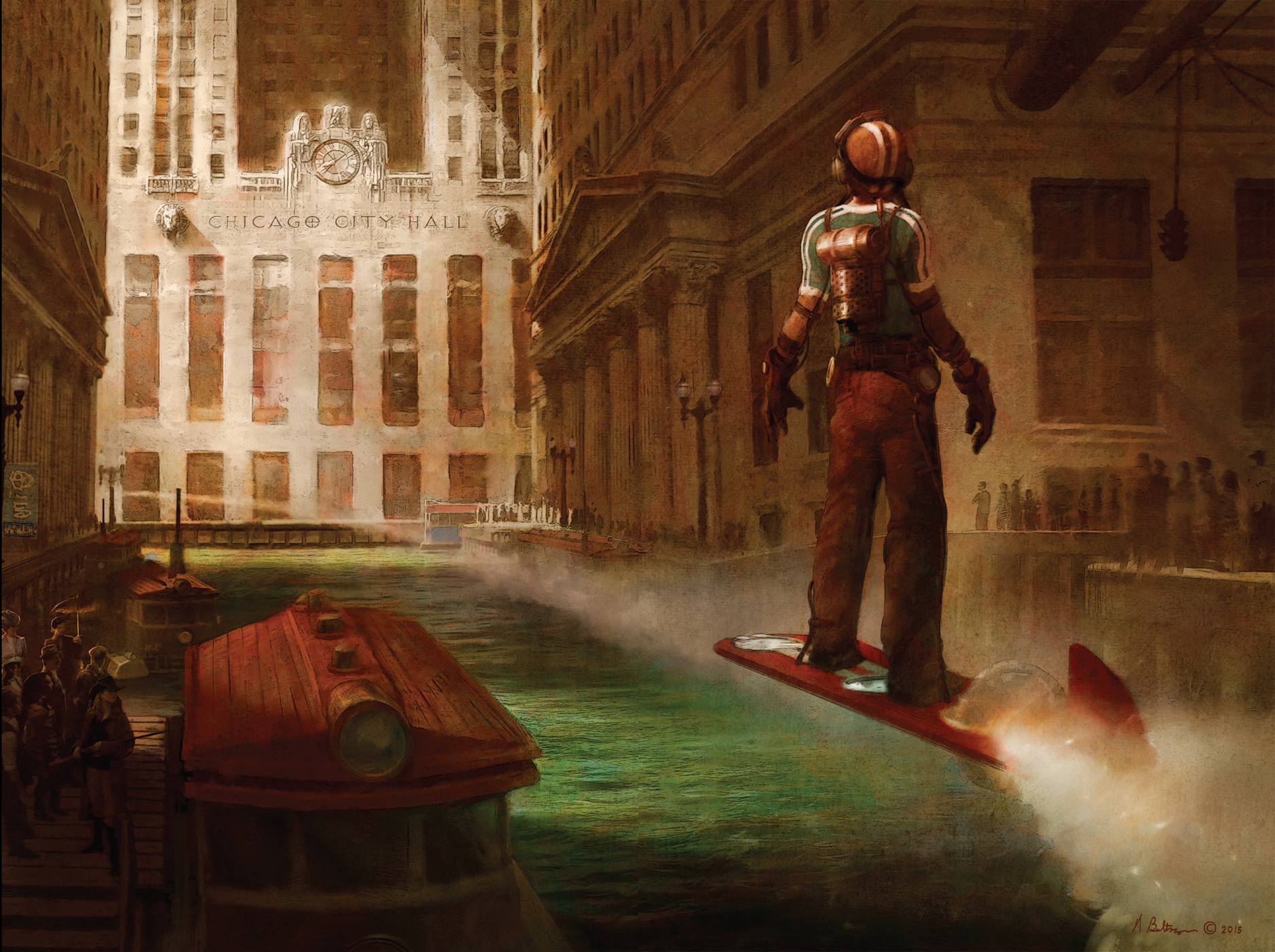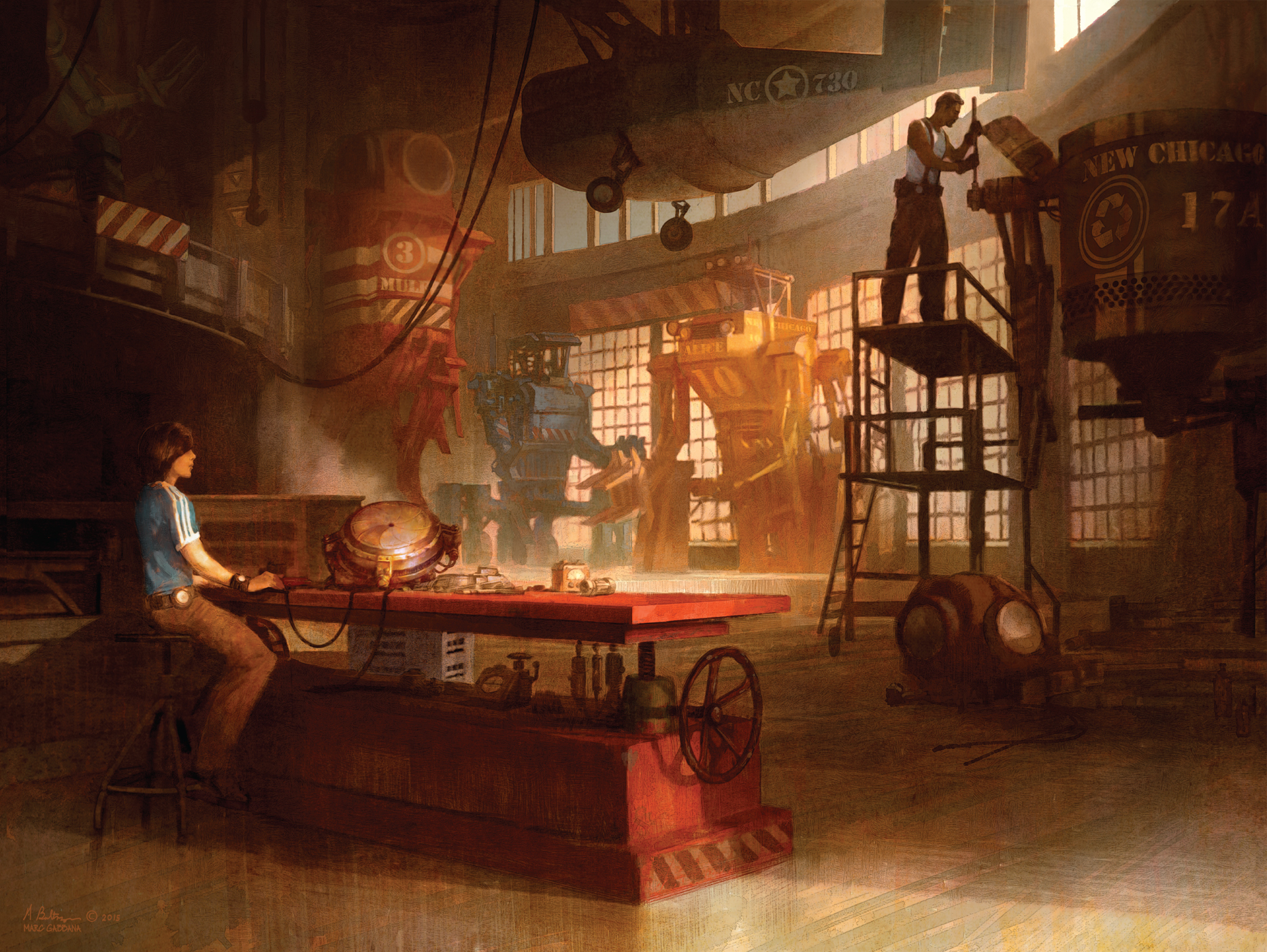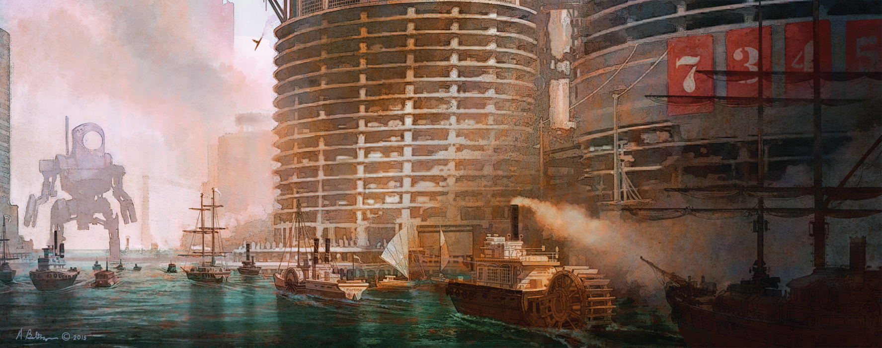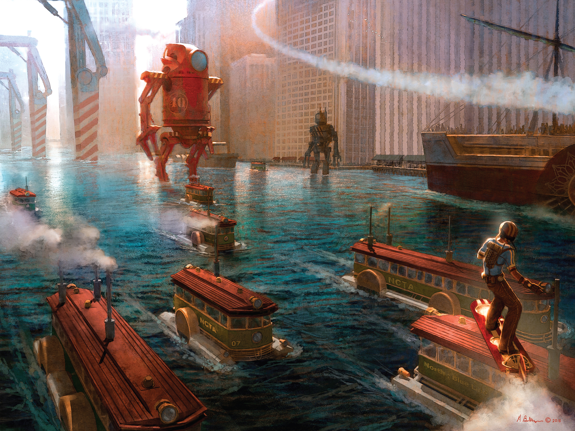 He sped over New Chicago, its canals and train tracks clogged with the morning traffic of steamships and trolleys, its sidewalks crowded with topcoats, leather tunics, and fine capes, a world collided in color and sound, in the smell of horse droppings and engine grease, corn roasting on food carts, and the sea. Off in the distance, the exhaust clouds from the great steamships and harbor robots colored the sunrise gold.