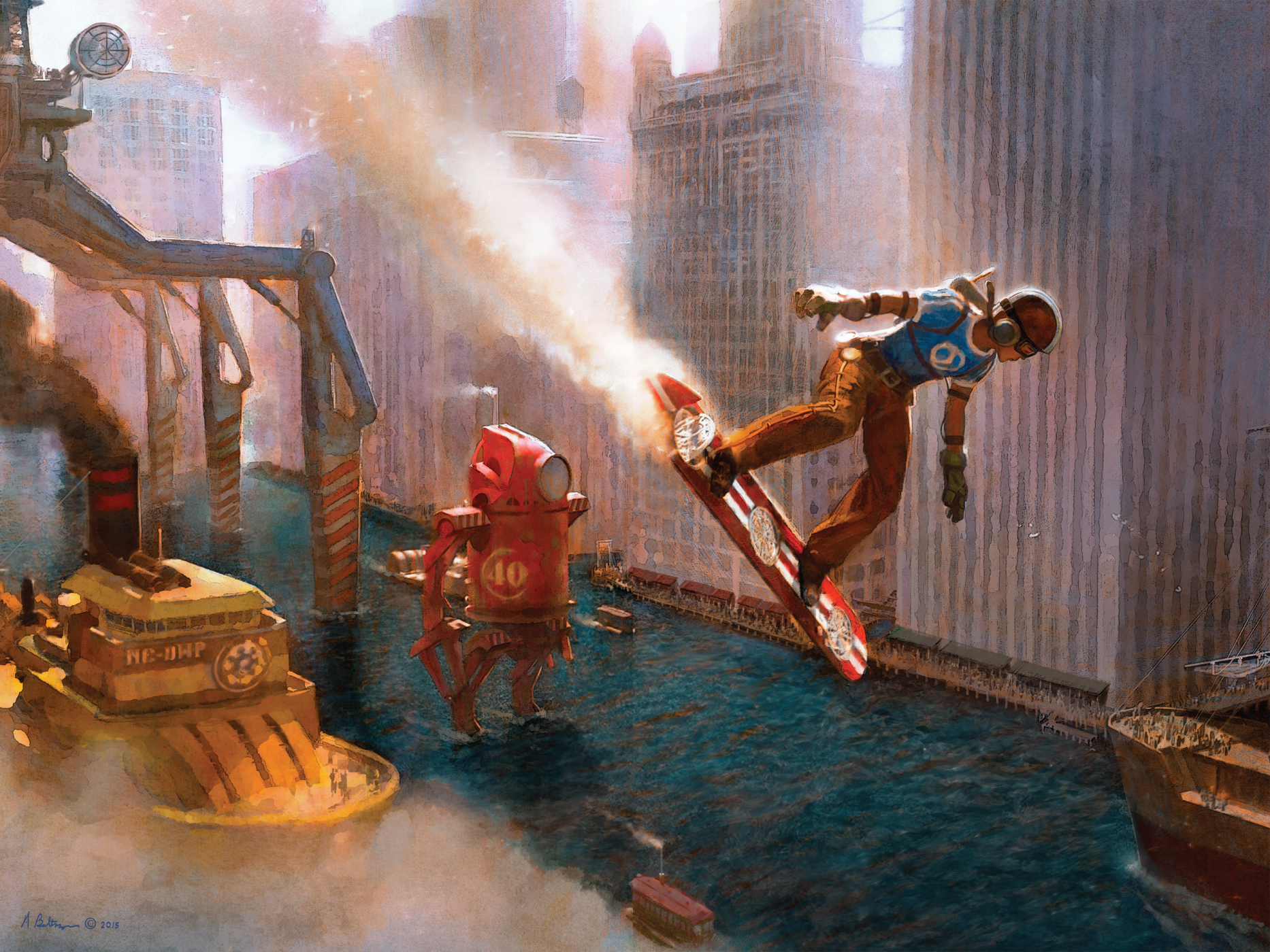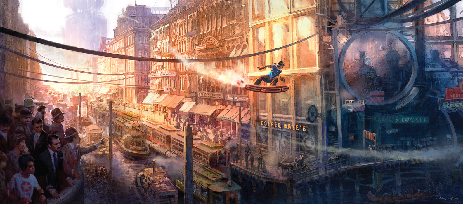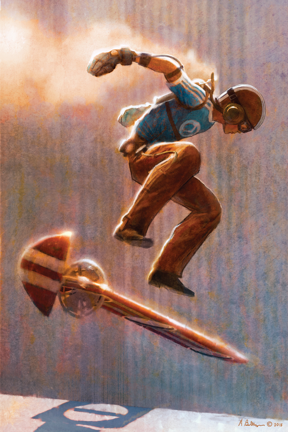The steam turbine whined at full strength, the board dug into the air, and Diego shot forward into a glide, skimming above the shop awnings and the Steam-Time ladies’ high hats.