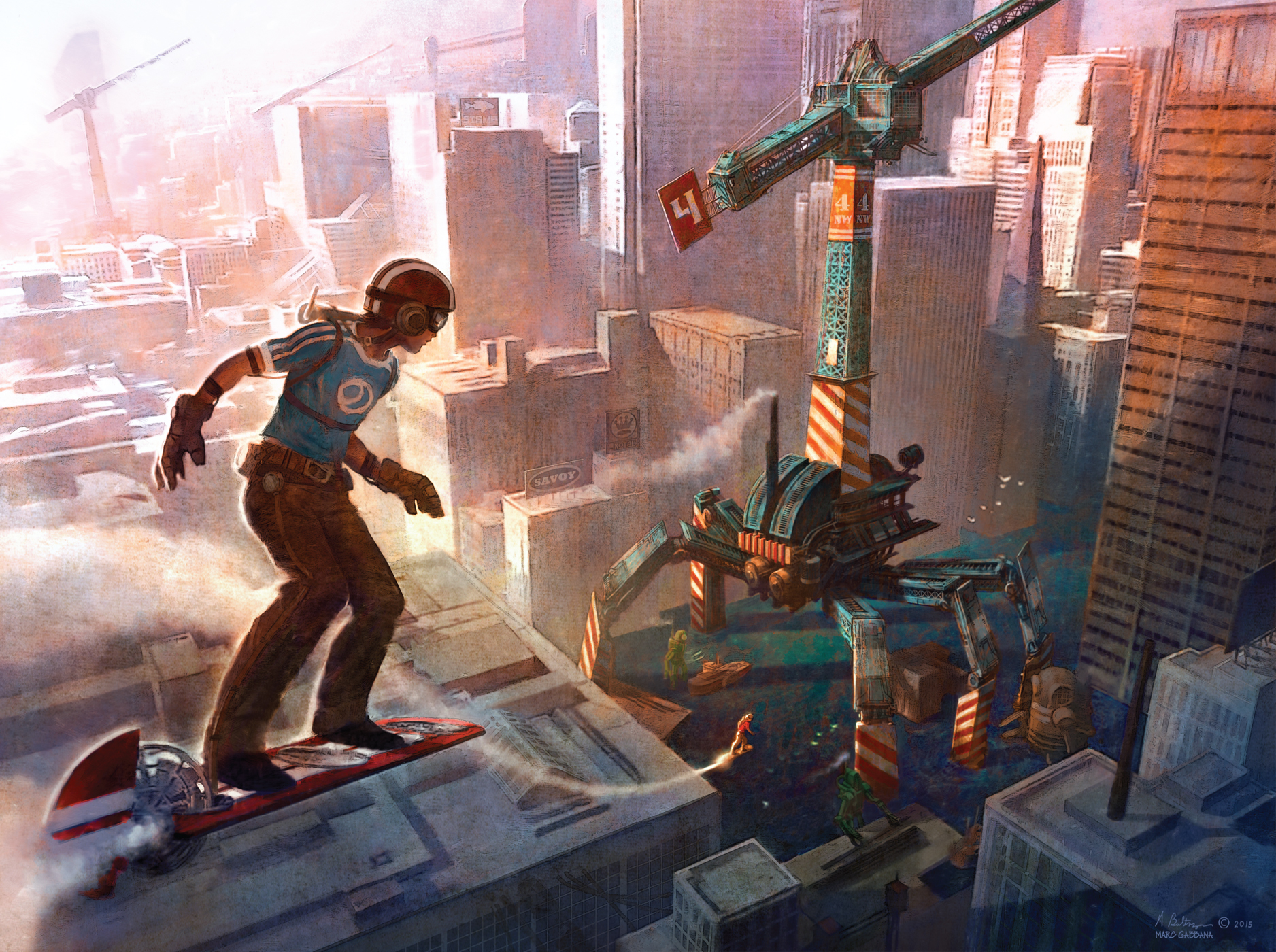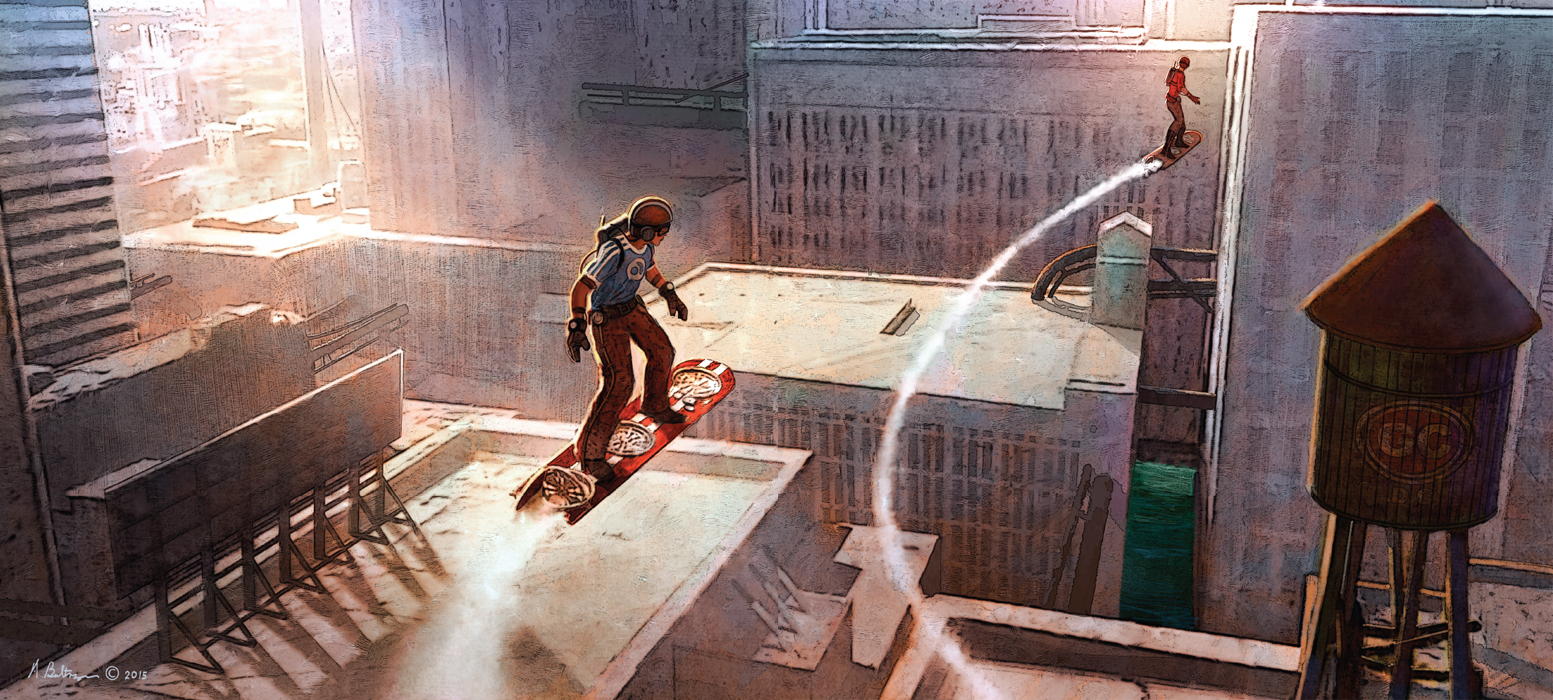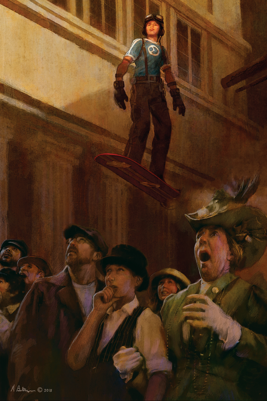 “No, don’t!” Diego rushed over. He gazed down at the bustling street ten stories below, but the girl wasn’t lying broken on the train tracks, nor floating faceup in the canal. Instead, she was speeding away through the air, on a gravity board of her own.