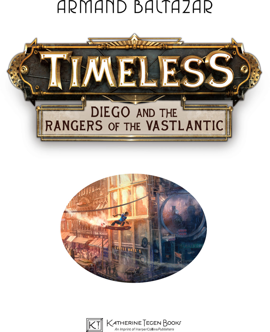 TIMELESS: DIEGO AND THE RANGERS OF THE VASTLANTIC. Copyright © 2017 by Armand Baltazar. All rights reserved under International and Pan-American Copyright Conventions. By payment of the required fees, you have been granted the nonexclusive, nontransferable right to access and read the text of this e-book on-screen. No part of this text may be reproduced, transmitted, downloaded, decompiled, reverse-engineered, or stored in or introduced into any information storage and retrieval system, in any form or by any means, whether electronic or mechanical, now known or hereafter invented, without the express written permission of HarperCollins e-books.
