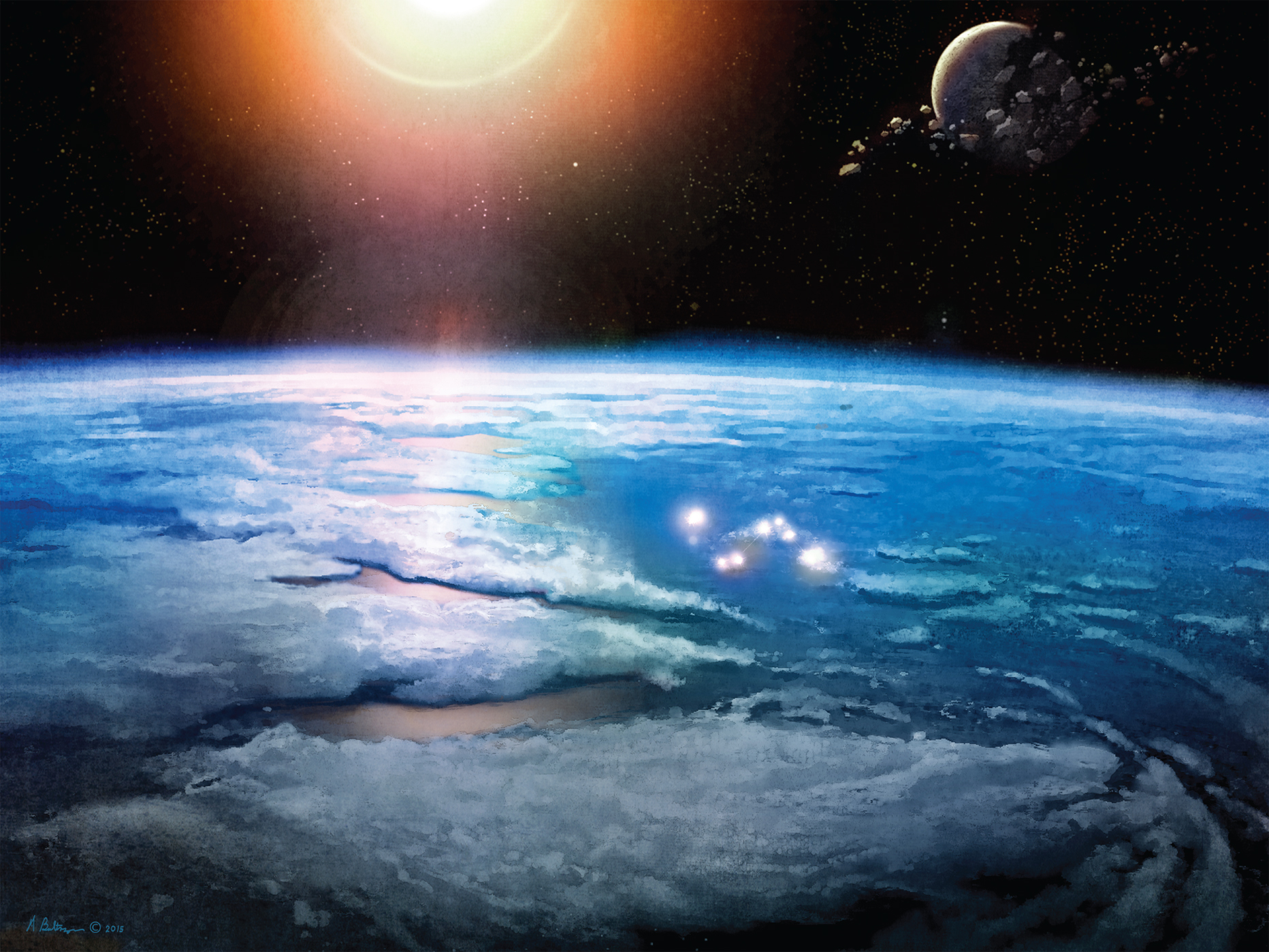 They turned sharply into a wide plaza around City Hall. The building was a grand tower, a mix of Elder and Mid-Time architecture, the plaza a series of floating walkways over water, with fountains burbling in intricate patterns. Diego was surprised to find the plaza packed with people, a huge crowd. More and more were streaming in from all sides, every one of them gazing upward and pointing.