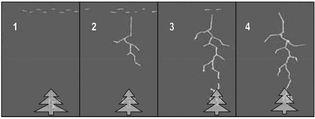 Здесь показана серия событий, в которых электрическое поле порождает молнию. На стадии 1 (рис. 1 слева) происходит нарастание поля. Небо заряжено отрицательно, а дерево внизу становится заряженным положительно. Затем, на следующей стадии (рис. 2) начинается молния, и так далее. На стадии 3 эта вспышка – теперь именуемая «лидером молнии» – делает ход. Можно видеть, что снизу навстречу «лидеру» идет «стример». На стадии 4 лидер и стример соединяются и возникает молния, которая «ударяет» в дерево и даже может его сжечь. От начала до конца весь процесс распространения молнии от неба до земли занимает одну пятую секунды.