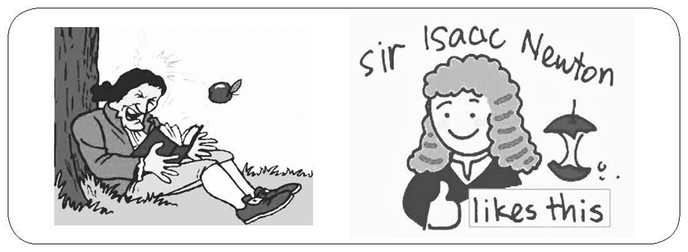 Как гласит легенда, он сидел и мирно размышлял над эффектом гравитации, как вдруг его стукнуло упавшее с дерева яблоко. Только тогда он понял, что было что-то, что тянуло яблоко вниз. Эта неприятность во 2-й фазе, можно сказать, пробудила его к знанию о гравитации (см. рисунок слева).