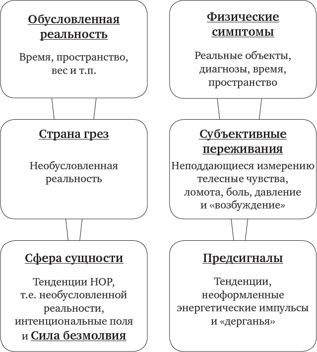 Подобно тому, как в радуге много цветов, так и в теле – как во всех материальных объектах – существуют различные «цвета» реальности. Один «цвет» соответствует «общепринятой реальности», осязаемым, физическим аспектам биомедицинской реальности, к которой все мы привыкли. В этой реальности «нормальное тело» обладает головой, двумя руками, двумя ногами, сердцем, и т. д., и рассматривается как объект, находящийся в пространстве и времени. Однако, подобно всем материальны объектам, тело имеет и другие «цвета», так сказать, другие «частоты». Тело обладает грёзоподобнымиразмерностями, которые нельзя легко измерить и соотнести с определенным местом в пространстве и времени. Мы можем измерять высоту, вес и температуру тела, но мы не можем непосредственно измерить и точно определить в пространстве и времени квантово-волновые паттерны тела или едва уловимые ощущения, которые оно, возможно, испытывает. Тем не менее, большинство людей могут чувствовать тонкие тенденции еще до того, как они проявляются в виде распознаваемых паттернов (как вы, возможно, пережили на собственном опыте в предыдущей главе).