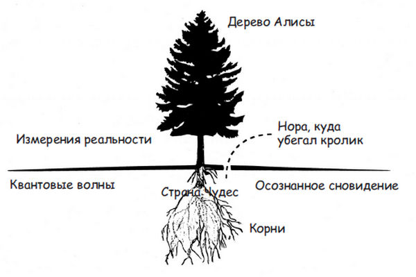 Основа материи в физике – так называемое квантовое волновое уравнение – подобно корням дерева в сказке об Алисе. На поверхности земли вы можете видеть дерево, порождаемое корнями, но не сами корни. Большинство из нас, подобно подруге Алисы, не решаются переживать Страну Чудес квантовых состояний, подземные корни реальности. Она просто менее привычна, чем обыденная реальность. Физики не склонны говорить об этих огромных корнях что-либо определенное и вместо этого сосредоточиваются на экспериментах в обыденной реальности, которые можно видеть и подтверждать доказательствами. Следующий рисунок резюмирует два вида реальности, описанные в сказке о Стране Чудес.