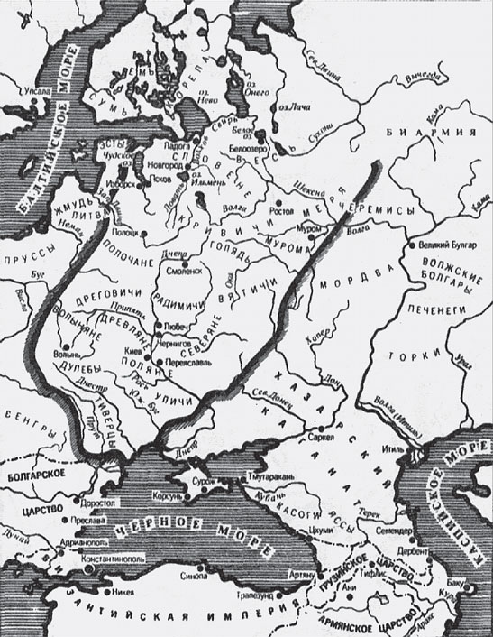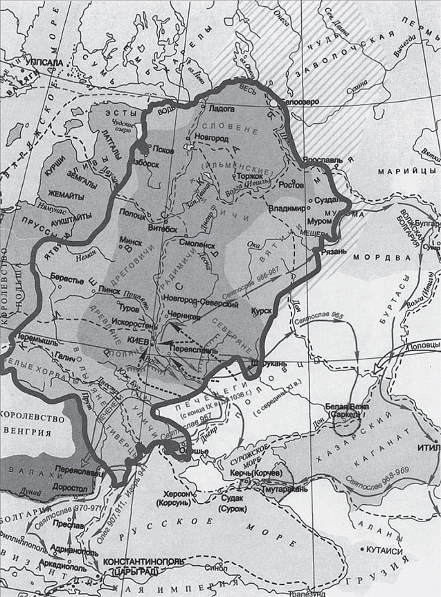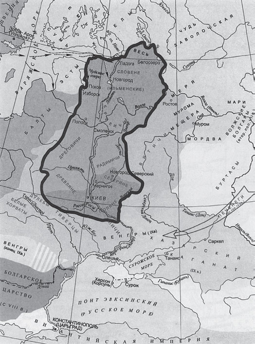 Путь от непрерывного отстаивания вооруженным путем своего права на жизнь к утверждению военной силой монополии собственного заселения как основы гарантии от физического уничтожения с последующим формированием своей государственности как прямого воплощения своего права на свою же монополию пути сообщения в пределах границ действия своей же монополии заселения прошла и Россия. Изначальным импульсом к этой действительно непрерывной вооруженной борьбе, в первую очередь за право на жизнь, послужило предрешенное логикой первой части Высшего Закона неоднократное кровавое «знакомство» оседлых восточных славян все с теми же гуннами, готами и другими степняками. Прорываясь на Запад, они далеко не единожды и не один век кряду волна за волной накатывались на земли восточных славян, опустошая их. В переводе на язык Высшего Закона это означает, что варвары огнем и мечом и, к сожалению, далеко не безуспешно пытались установить свою монополию пути сообщения на Запад через земли восточных славян. Вследствие этого изначально осознававшаяся как вооруженная борьба за право на жизнь едва ли не мгновенно перетекла в плоскость отстаивания все тем же вооруженным путем, но уже монополии заселения оседлых восточных славян. Дойдя же впоследствии до возможной в те далекие времена высшей в своем развитии стадии, такая организационная база превратилась в краеугольный камень фундамента, опираясь, в свою очередь, на который и под воздействием логики второй части Высшего Закона стали генерироваться зачатки основ будущей государственности восточных славян, в том числе и Руси изначальной.