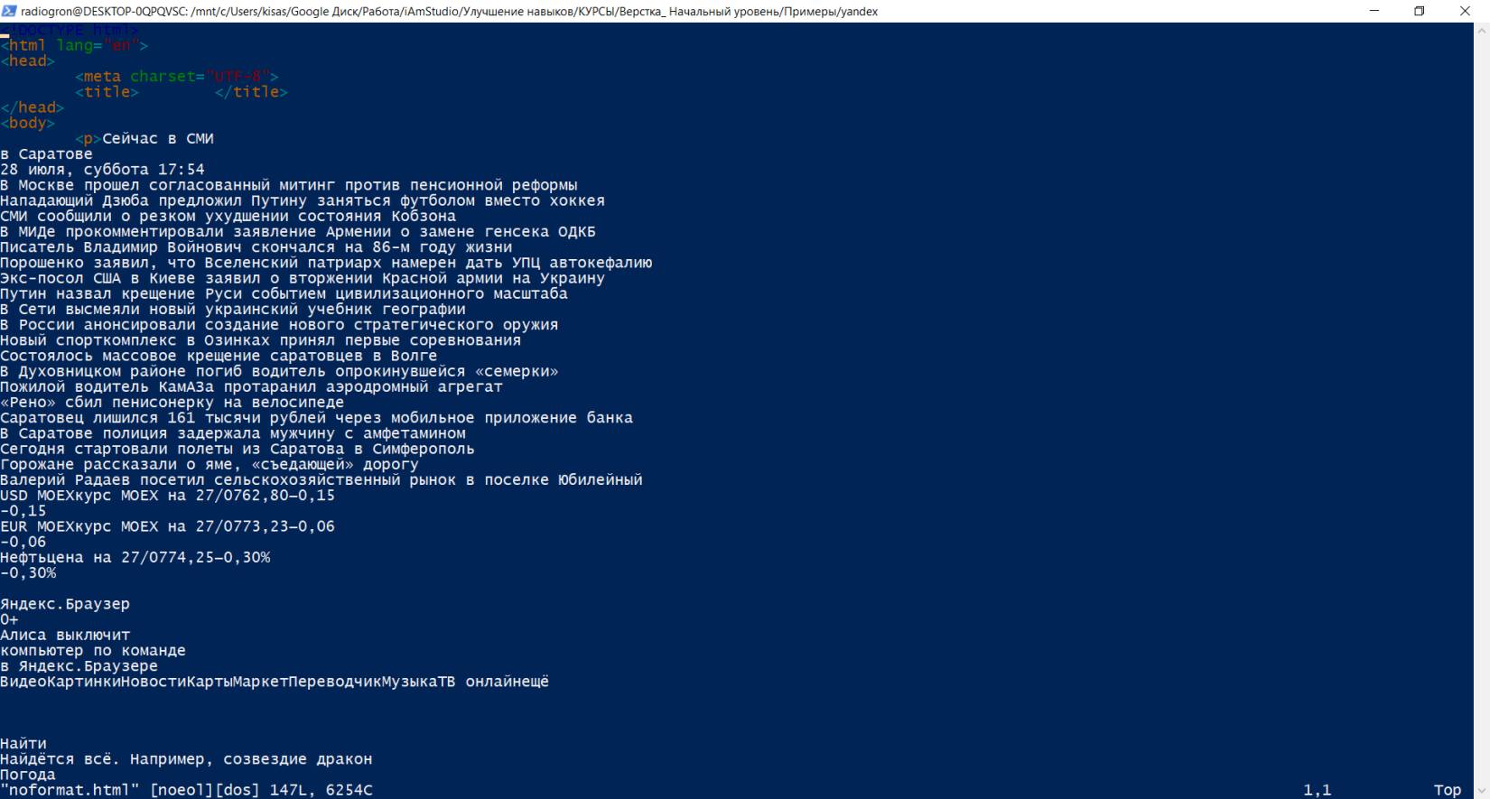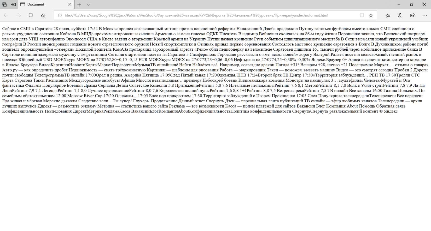 Для наглядности я удалил тег head вместе со всем содержимым. Внутри были стили и скрипты. И много всякой полезной ерунды, без которой мы можем видеть отформатированный, де-факто сверстанный текст. В данном случае текст и информацию вывел сервер, так что если вы проделаете то же самое у себя на компьютере, то увидите другой текст на главной странице.
