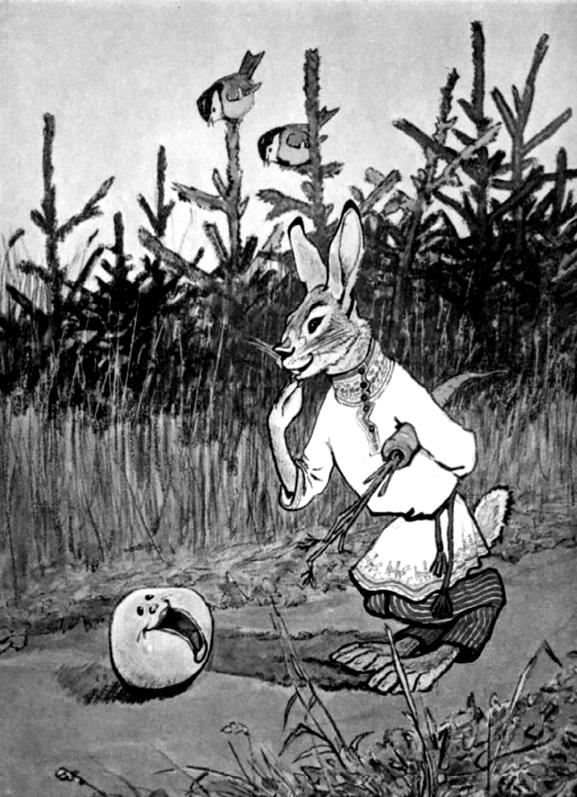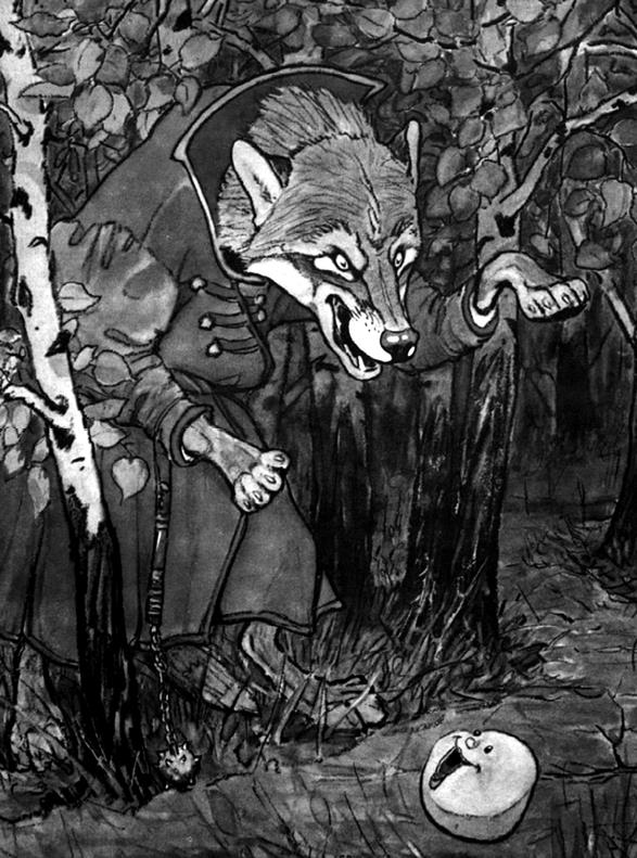 Я по коробу скребен,По сусеку метен,На сметане мешонДа в масле пряжон,На окошке стужон;Я у дедушки ушел,Я у бабушки ушел,Я у зайца ушел,У тебя, волка, не хитро уйти!И покатился себе дальше; только волк его и видел!..