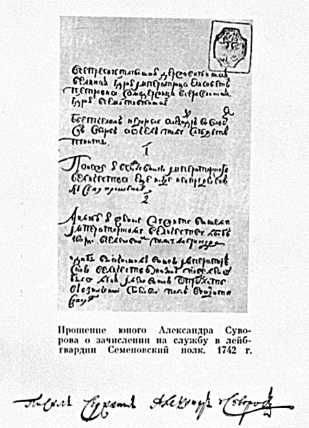 Прошение юного Александра Суворова о зачислении на службу в лейб-гвардии Семёновский полк. 1742 г.
