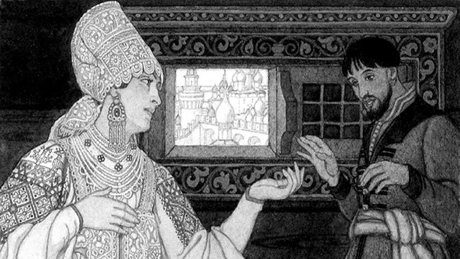 Федот повернулся налево кругом и пошел из дворца; вечером приходит домой крепко печальный, не хочет и слова вымолвить. Спрашивает его жена: «О чем, милый, закручинился? Аль невзгода какая?» Он рассказал ей все сполна. «Так ты об этом печалишься? Есть о чем! Это службишка, не служба. Молись-ка богу да ложись спать; утро вечера мудренее: все будет сделано». Стрелец лег и заснул, а жена его развернула волшебную книгу – и вдруг явились перед ней два неведомых молодца: «Что угодно, что надобно?» – «Ступайте вы за тридевять земель, в тридесятое царство – на остров, поймайте оленя золотые рога и доставьте сюда». – «Слушаем! К свету все будет исполнено».