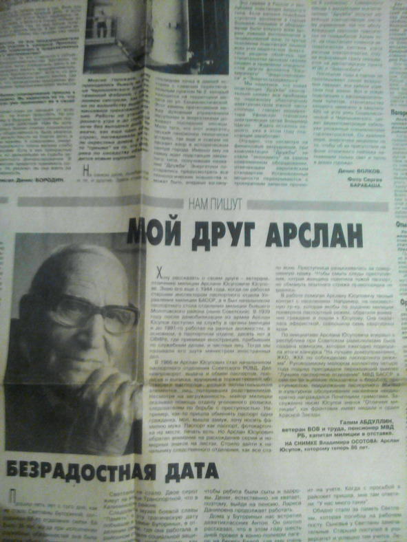 В прошлом году друзья и родные отмечали 85-летие со дня рождения ветерана, отличника милиции Арслана Юсуповича Юсупова. В 1939 году после демобилизации из армии он поступил на службу в органы милиции города Карши и до 1991 года работал на разных должностях. В 1944 году прибыл в Уфу, работал в аппарате управления милиции БАССР. Арслан Юсупович работал почти во всех отделах управления, в основном, в паспортном отделе, десять лет в ОВИРе. Принимал иностранцев, прибывших по частным делам, и частных лиц. Одним словом, его, шутя, называли министром иностранных дел БАССР.
