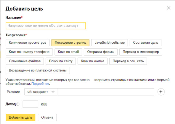 Вот для примера, как выглядит функционал Яндекс Метрики по настройке целей: