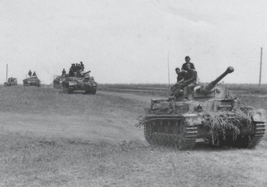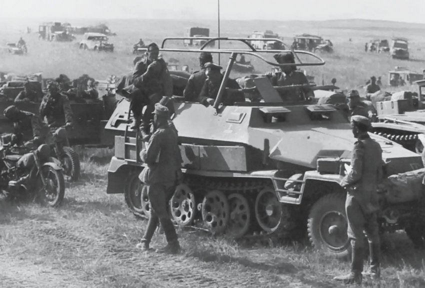 Техника 16-й танковой дивизии вермахта в степи. В центре на бронетранспортере виден командир дивизии генерал-майор Ганс-Валентин Хубе (Hans-Valentin Hube)