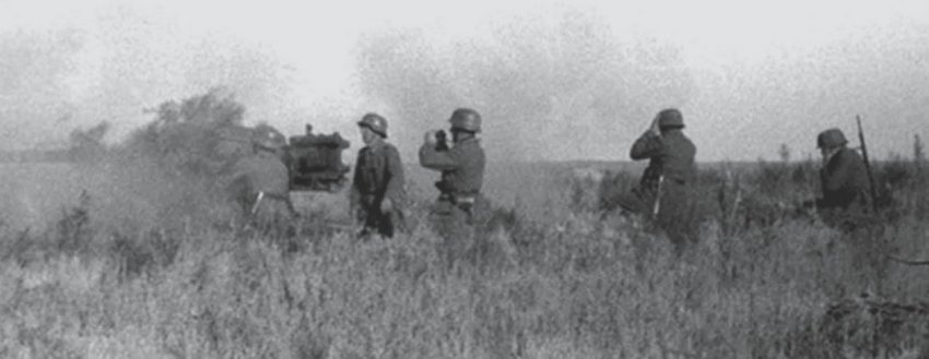 Танк с черно-белым крестом на башне внезапно остановился у бруствера нашего окопа. Из распахнутого люка показался танкист в черной форме и гортанно крикнул: «Русь, сдавайсь!» Стоявший рядом со мной Виктор Пучков вскинул винтовку, но тут же упал, сраженный выстрелом танкиста. И вот уже в окоп летит граната. Взорвавшись под упавшим Виктором, она не зацепила меня осколками. Люк захлопнулся, танк взревел двигателем и принялся утюжить наши окопы, наполовину присыпав землей и меня. Придя в себя, я увидел ужасную картину. Кроме меня и тяжело раненного Домбровского, из расчета в живых не осталось никого. Миномет был также раздавлен гусеницами танка. Перебинтовав раненого и собрав медальоны и комсомольские билеты убитых товарищей, я стал ждать темноты, так как кругом стояли немецкие танки».