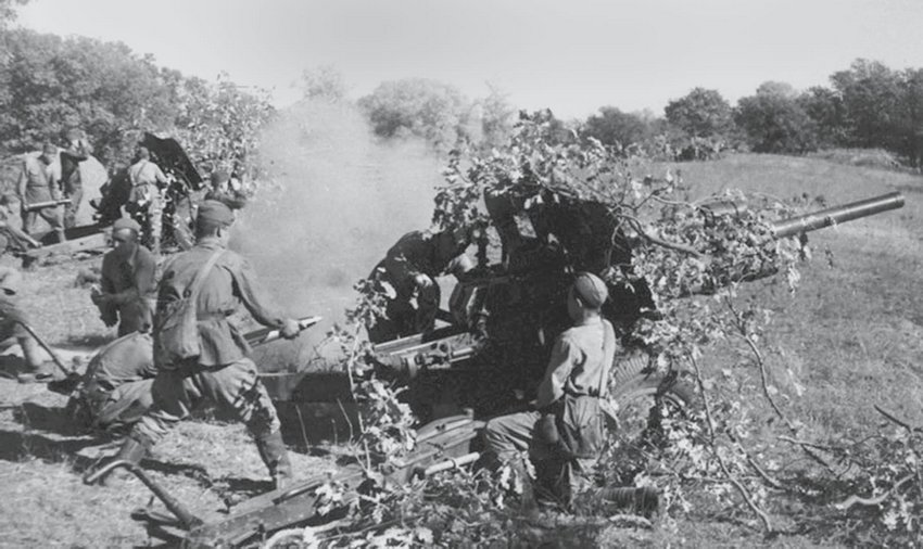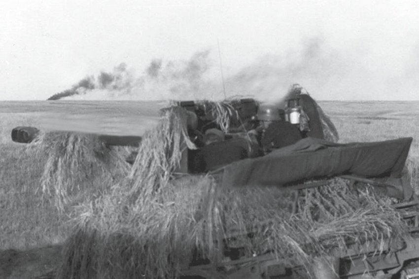 Замаскированная снопами самоходная артиллерийская установка «Мардер III» ведет огонь по советским танкам