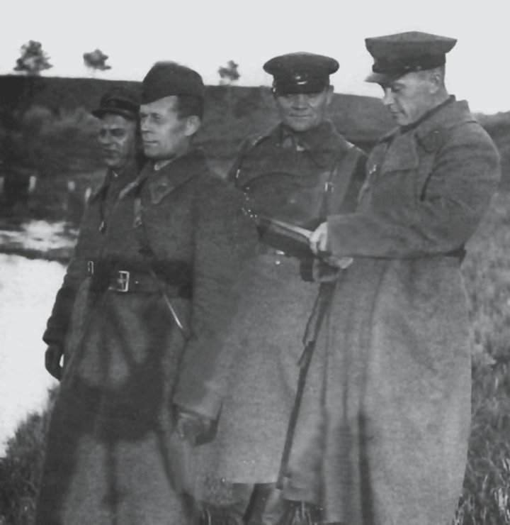 Командование 166-й танковой бригады: начальник штаба Иван Данилович Приорунский, командир бригады Игнатий Андреевич Коробицын, комиссар штаба Николай Егорович Удалов. Фото сделано весной 1942 года