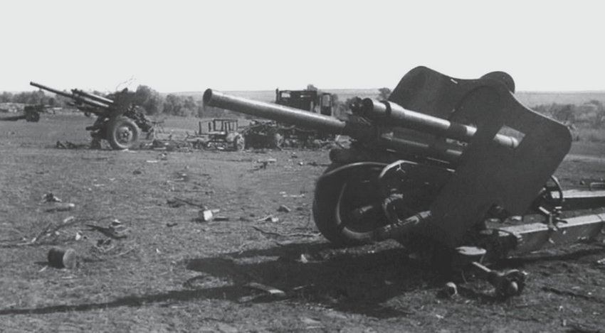 Уничтоженные 76-мм орудия и трактора: расчеты застигнутой врасплох батареи даже не успели развести станины