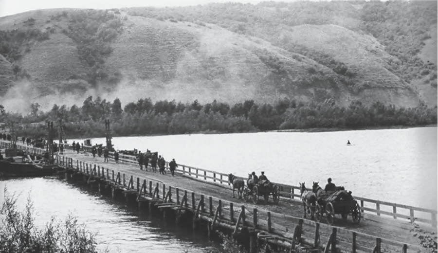 На том берегу грохочет. Снаряды и мины рвутся и у моста. Они прилетают откуда-то справа и то бухаются в воду, вздымая белые пышные концы, вокруг которых играет радуга, то вонзаются в берег, расшвыривая во все стороны осколки и землю. По мосту, упирающемуся на том берегу в горловину оврага, двигаются танки 56-й бригады. Скатившись с моста, машины набирают скорость и устремляются проселочной дорогой, вьющейся по дну оврага. Там, где они скрываются, за поворотом стоит плотная пелена пыли.