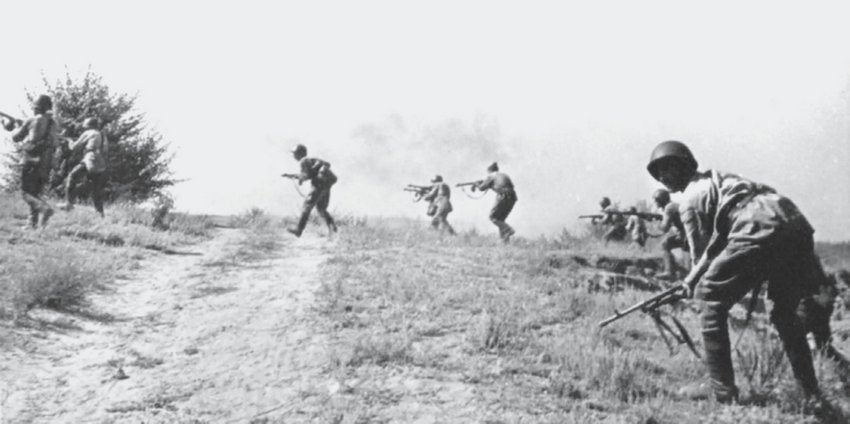 Советская пехота поднимается в атаку по пологому склону высоты