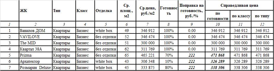 В рассматриваемом примере все квартиры совпадают по классу (бизнес-класс) и типу недвижимости (квартиры, не апартаменты). Если бы среди аналогов был апартаментный комплекс, то в таблице бы появился дополнительный столбец, в котором стоимость 1 м2 в этом объекте была «приведена» к стоимостям аналогов (путем добавления 12-15% к цене).
