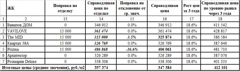 Поправок по классу и типу не вносилось, так как все сравниваемые объекты идентичны. В VAVILOVE, The MID, «Квартал 38А» и Prizma представлены квартиры без отделки, поэтому необходимо привести их цены к квартирам в состоянии «white box». Здесь обошлось без каких-либо сложных формул, чтобы квартира без отделки превратилась в квартиру с отделкой «white box» необходимо потратить примерно 15 тыс. рублей на 1 м2. Собственно, этот параметр и был учтен. Например, стоимость 1 м2 в ЖК «The MID» увеличилась с 300 тыс. рублей до 315 тыс. рублей. Все изменения были отражены в столбце 14.