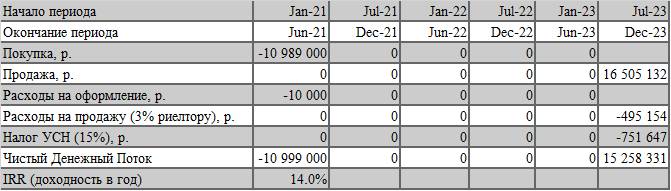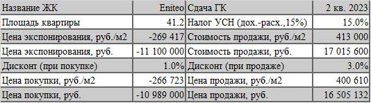Для инвестиционного анализа была взята квартира площадью 41,2 м2 минимальной стоимостью по прайсу 11 100 тыс. рублей с отделкой «white box» (цена, которая была актуальна для старта продаж). В связи с большим наплывом потенциальных покупателей на старте продаж в примере предусмотрено предоставление «номинальной» скидки в размере 1%. Итоговая цена 1 м2 таким образом составила 268 тыс. рублей, а общая стоимость инвестиций – 10 989 тыс. рублей. Выход из проекта предполагалось осуществить в 3 квартал 2023 г.