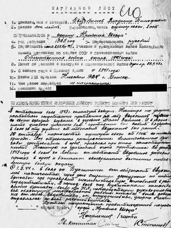 В роте осталось 19 человек, а было 50 или 55. Ну, я думаю: «Все, Евдокимову трибунала не миновать». Ведь я же понимаю, что это огромные потери. Нашей 184-й дивизией командовал генерал Басан Городовиков – калмык, рослый, красивый, смелый, умный. Потом мы несколько раз с ним в Москве встречались. Поскольку мы первые «достигли логова зверя», несмотря на такие большие потери, двух ротных – меня и капитана Матихина – представили к званию Героя Советского Союза. 24 марта 1945 года был указ!