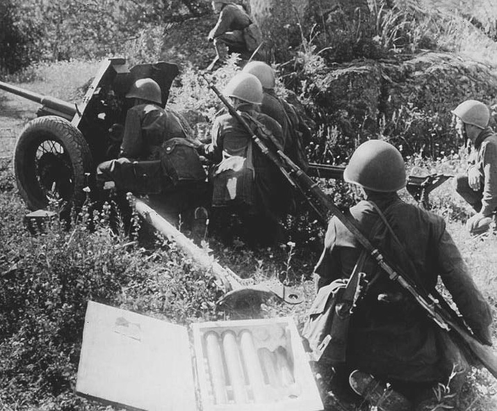 С началом Великой Отечественной войны противотанковые возможности советских войск подверглись жестоким испытаниям. Во-первых, чаще всего стрелковым дивизиям приходилось вести бой, занимая превышающий уставные нормативы фронт обороны. Во-вторых, советским войскам пришлось столкнуться с немецкой тактикой «танкового клина». Она заключалась в том, что танковый полк танковой дивизии Вермахта наносил удар на очень узком участке обороны. При этом плотность атакующих танков составляла 50–60 машин на километр фронта. Такое количество танков на узком фронте неизбежно насыщало противотанковую оборону. Значительно облегчалась задача насыщения советской ПТО ее линейностью, т. е. равномерным расположением орудий по фронту обороны. Свою роль также сыграли технические сложности: ряд партий 45-мм бронебойных снарядов был перекален. Термообработанные с нарушением технологии снаряды не пробивали немецкие танки даже на тех дистанциях, на которых должны были это делать по ТТХ. Спасением в условиях кризиса стали 76-мм дивизионные и полковые орудия. Короткоствольные 76-мм полковые пушки образца 1927 года были ближе всего по весу и габаритам к противотанковым пушкам. При этом их бронебойный или даже шрапнельный выстрел был достаточно эффективным против немецких танков 1941 года.