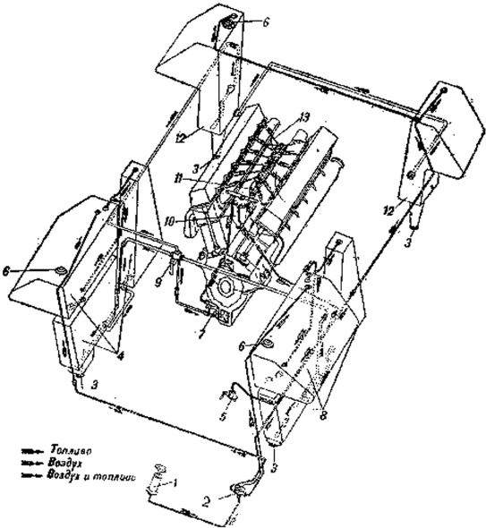 1 – воздушный насос; 2 – воздушный распределительный кран; 3 – сливная пробка; 4 – правые бортовые баки; 5 – сливной кран; 6 – заливная пробка; 7 – топливоподкачивающая помпа; 8 – левые бортовые баки; 9 – топливный распределительный кран; 10 – топливный фильтр; 11 – топливный насос; 12 – кормовые баки; 13 – топливопроводы высокого давления.
