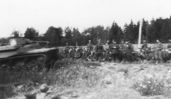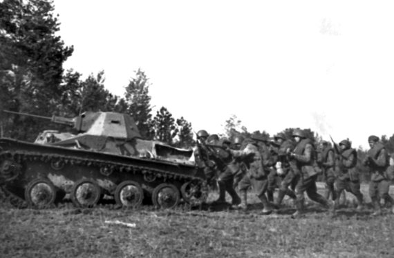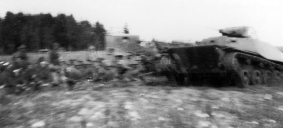 Подготовка бойцов мотострелкового батальона к отражению танковой атаки. Преодаление так называемой «танкобоязни» было одним из необходимых элементов обучения пехотинцев. В качестве немецкого танка используется «Т-40»