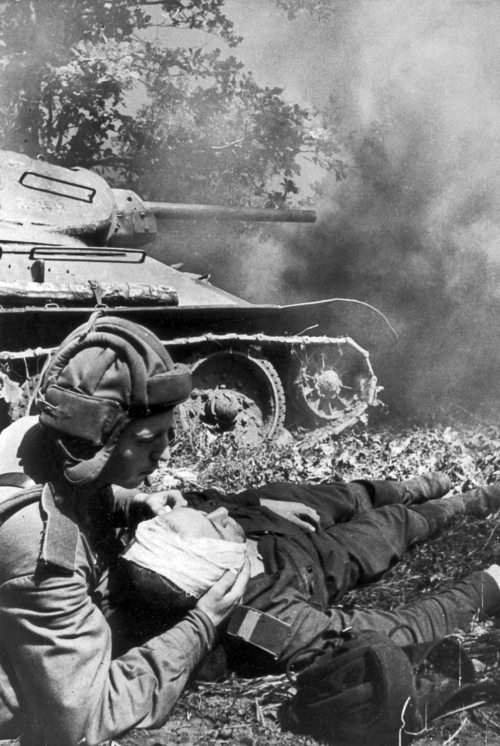 Перевязка раненого танкиста. Фотография сделана не ранее лета 1943 года, поскольку оба бойца уже одеты в гимнастерки с погонами