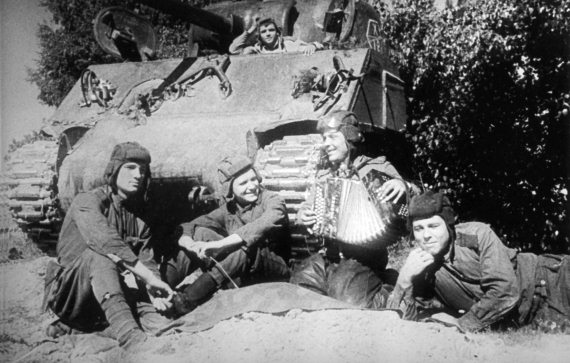 Экипаж танка М4А2 «Шерман» на отдыхе. Расстелен танковый брезент, в руках у старшины появилась гармошка…