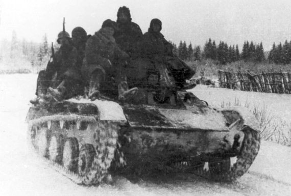 Разведчики 1-й мотострелковой дивизии, вооруженные «ППШ», «ППД» и карабином, на танке «Т-40». Декабрь 1941 года