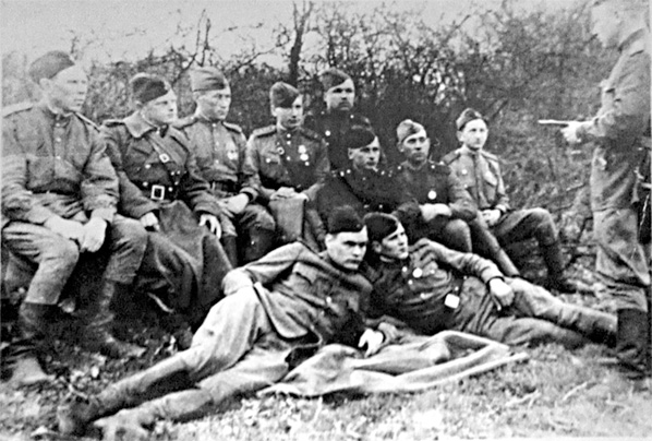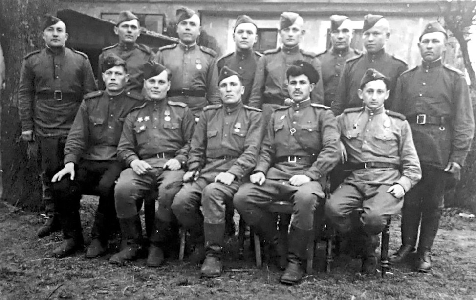 «Всё, что осталось от нашей роты». Сидят слева направо: Королёв, Шумейко (к-р роты), Филатов (к-р взвода), через одного Ликвер. Первый слева стоит повар, третий слева Кудинов (расстрелян за мародёрство и насилие), пятый слева Кусь. Перед наступлением на Берлин